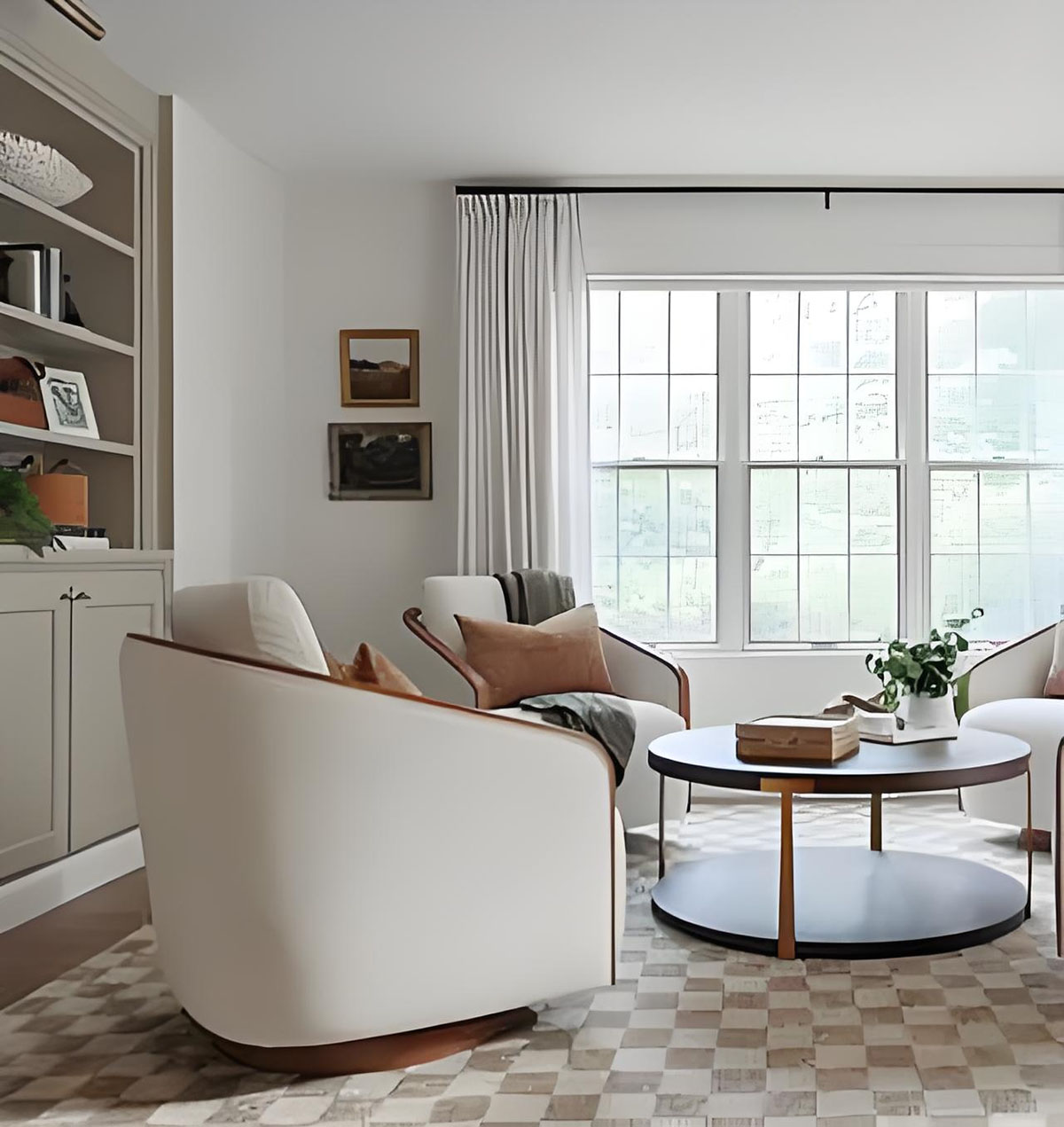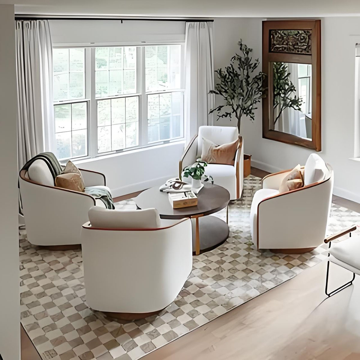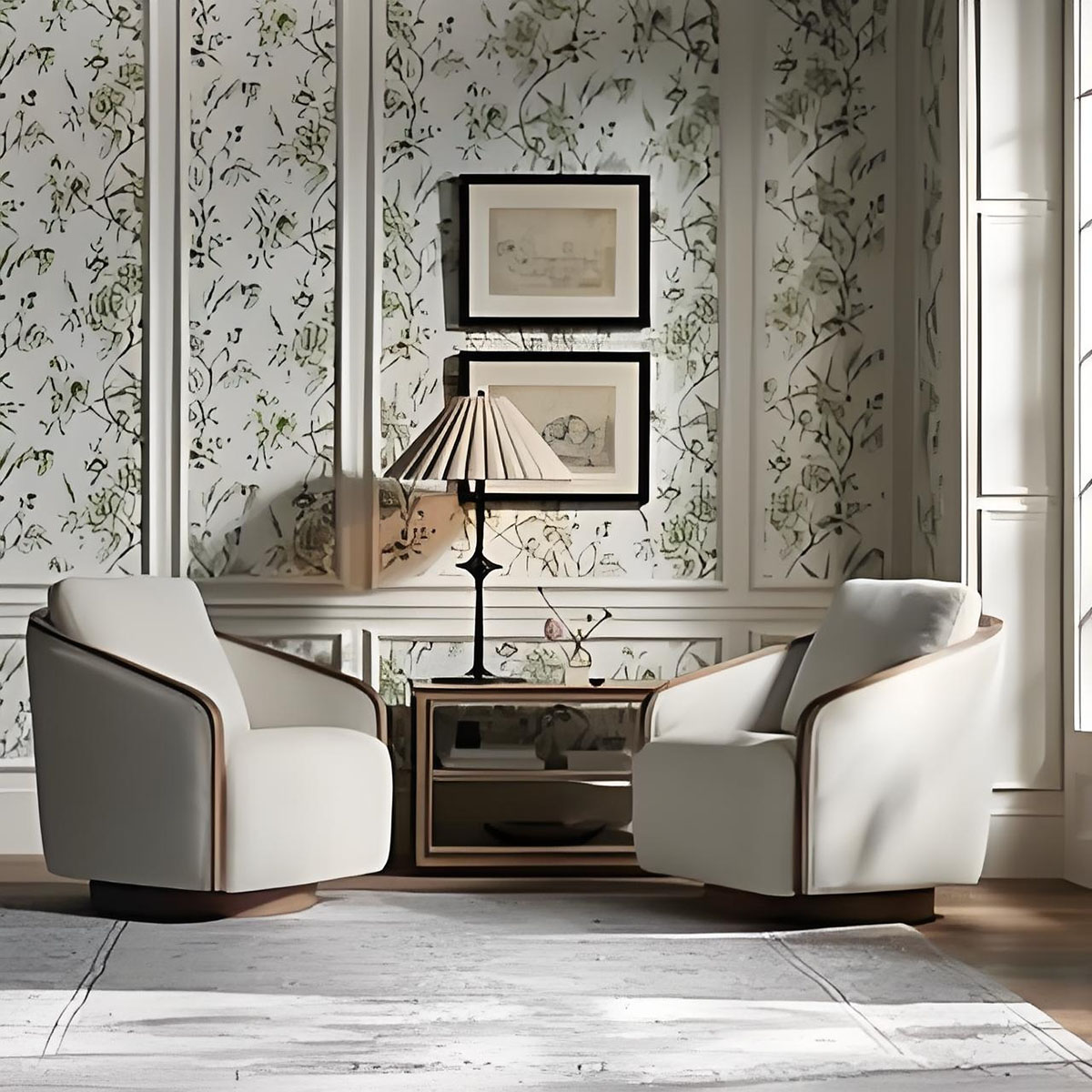 - Exposed oak edges on the arms and swivel base complement the neutral, soft tones of the cushions.